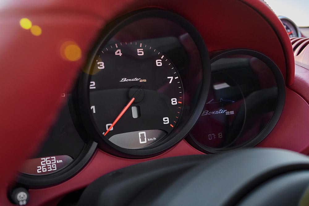 I stil med det historiska originalet har specialmodellen läderklädsel i Bordeaux Red i kombination med rött cabriolettak. Suffletten är präglad med bokstäverna ”Boxster 25”. Både läderinteriör och sufflett erbjuds även i svart. Några detaljer ur den nya modellens omfattande standardutrustning är inredningspaket i aluminium, 14-vägs elektriskt justerbara sportstolar, instegslister med texten ”Boxster 25” och eluppvärmd läderratt med multifunktion.