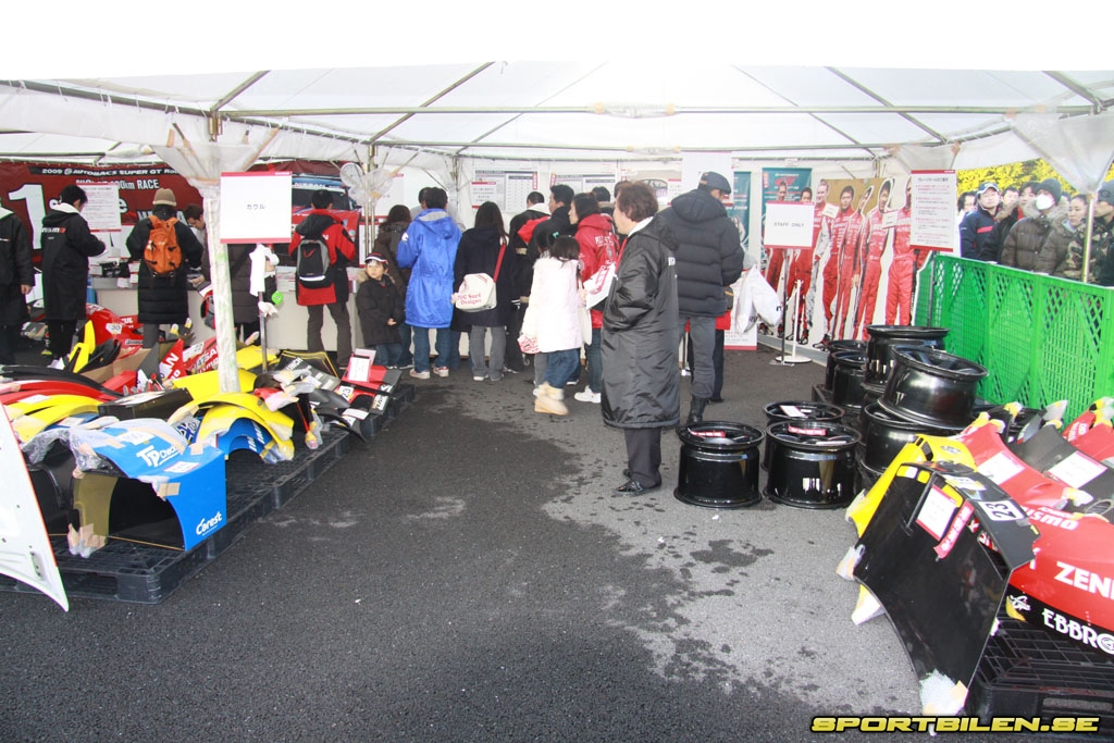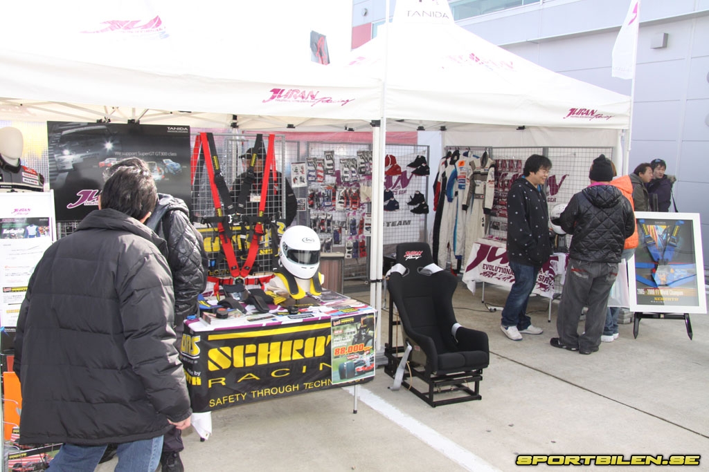Medan full aktivitet sker på banan så fylls depåområdet ständigt på med en strid ström av nya besökare. Depåområdet på Fuji Speedway är enormt. Ett 30-tal stora depågarage med tillhörande VIP-hus utgör grunden till det stora depåhuset. Utanför depågaragen är det marknad. Här finns alla de stora tillverkarna av eftermarknadsdelar representerade – Tomei, RAYS och HKS för att nämna några. Alla har montrar, demobilar och försäljning på plats. Försäljningen sker självklart med reducerade mässpriser dagen till ära. Området är oerhört populärt och ivrig kommers pågår med oförändrad styrka under hela dagen.