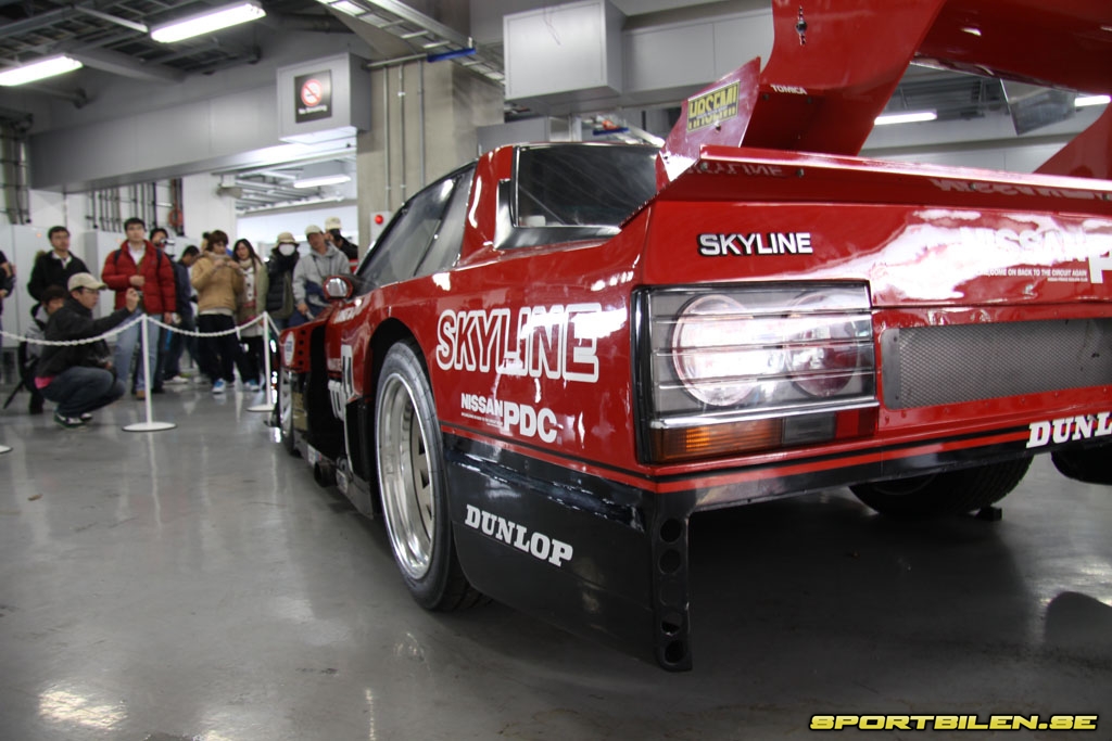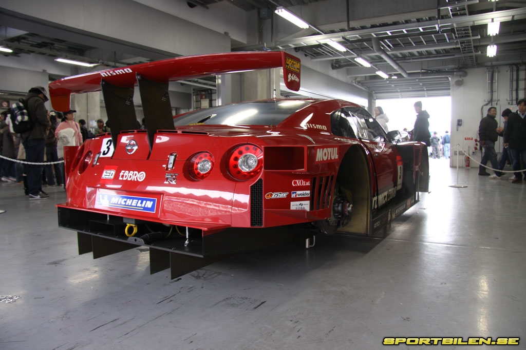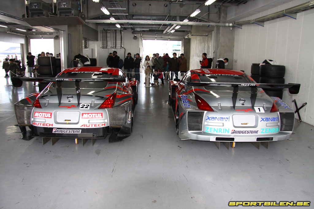 Inne i depågaragen står allt från Nissans historiska tävlingsbilar till de bilar som är här idag för uppvisningslopp. Det är ett otroligt tryck från fans och press under hela dagen. Några av förarna som i Japan hyllas som riktiga superstjärnor bjuder på att låta sig fotograferas till folkets jubel. Har man löst biljett tillåts man sitta i förarsätet på en Z33 GT500, starta och torrköra bilen ett ögonblick. En omåttligt populär programpunkt.