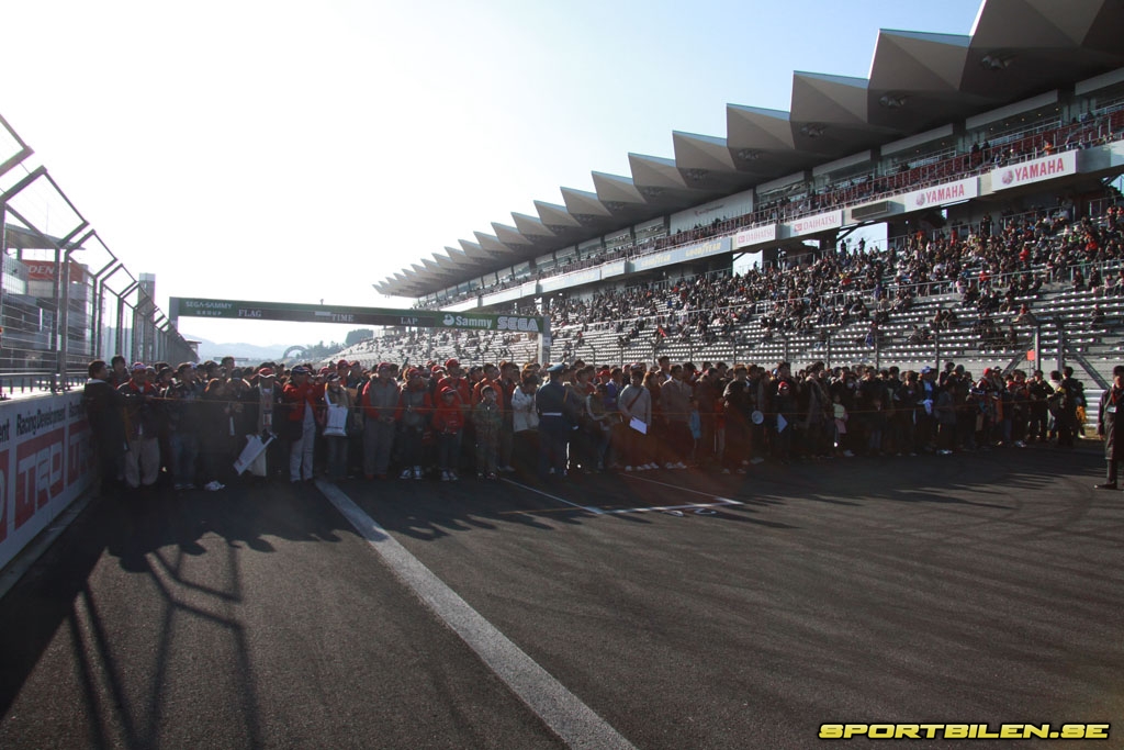 När spärrbandet släpps av funktionärerna infinner sig någon form av kontrollerat kaos när alla ivriga fans springer runt. Efter bara några sekunder är hela start- & målrakan fullständigt fylld av hängivna fans som jagar autografer, fotograferar bilar och är helt uppslukade av känslan av att stå nära sina föraridoler och tävlingsbilarna. Hade detta varit någon annanstans hade upplevelsen varit riktigt skrämmande, men japanernas respekt för varandra gör att det kaos som ändå infinner sig är fullständigt kontrollerat. Ingen knuffas eller trängs och ändå är det både trångt och full fart som gäller för samtliga.